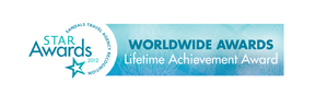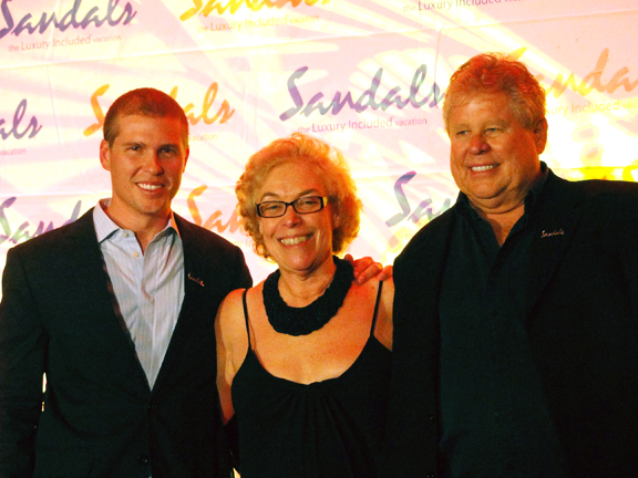 Sandra accepts the 2012 Sandals' Lifetime Achievement Award from Sandals CEO Adam Stewart and Chairman Gordon "Butch" Stewart.